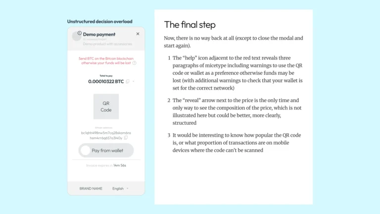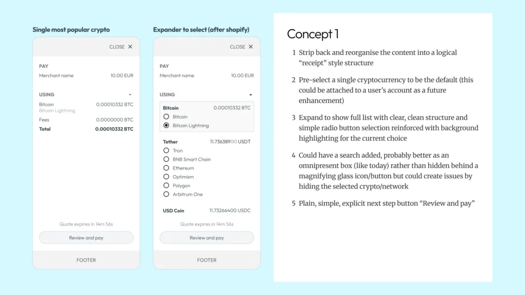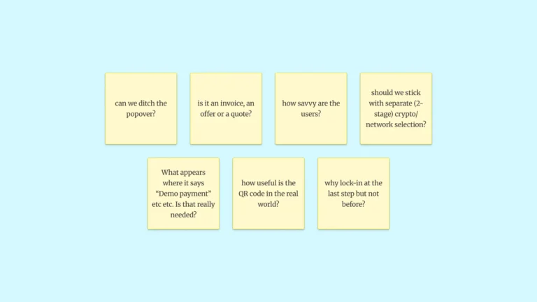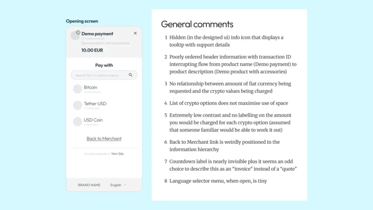Before sketching anything, I needed to understand what “good” looks like in this space. Crypto checkouts sit in an odd position – they need the trust cues of traditional payment flows but handle unfamiliar concepts like wallet selection and network fees. I spent roughly half my time on research: benchmarking industry patterns, reviewing Baymard’s checkout guidelines, and documenting the existing experience.