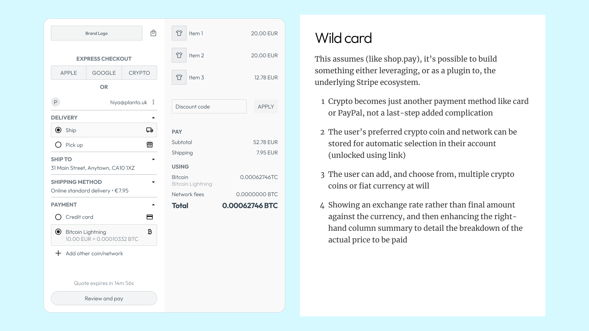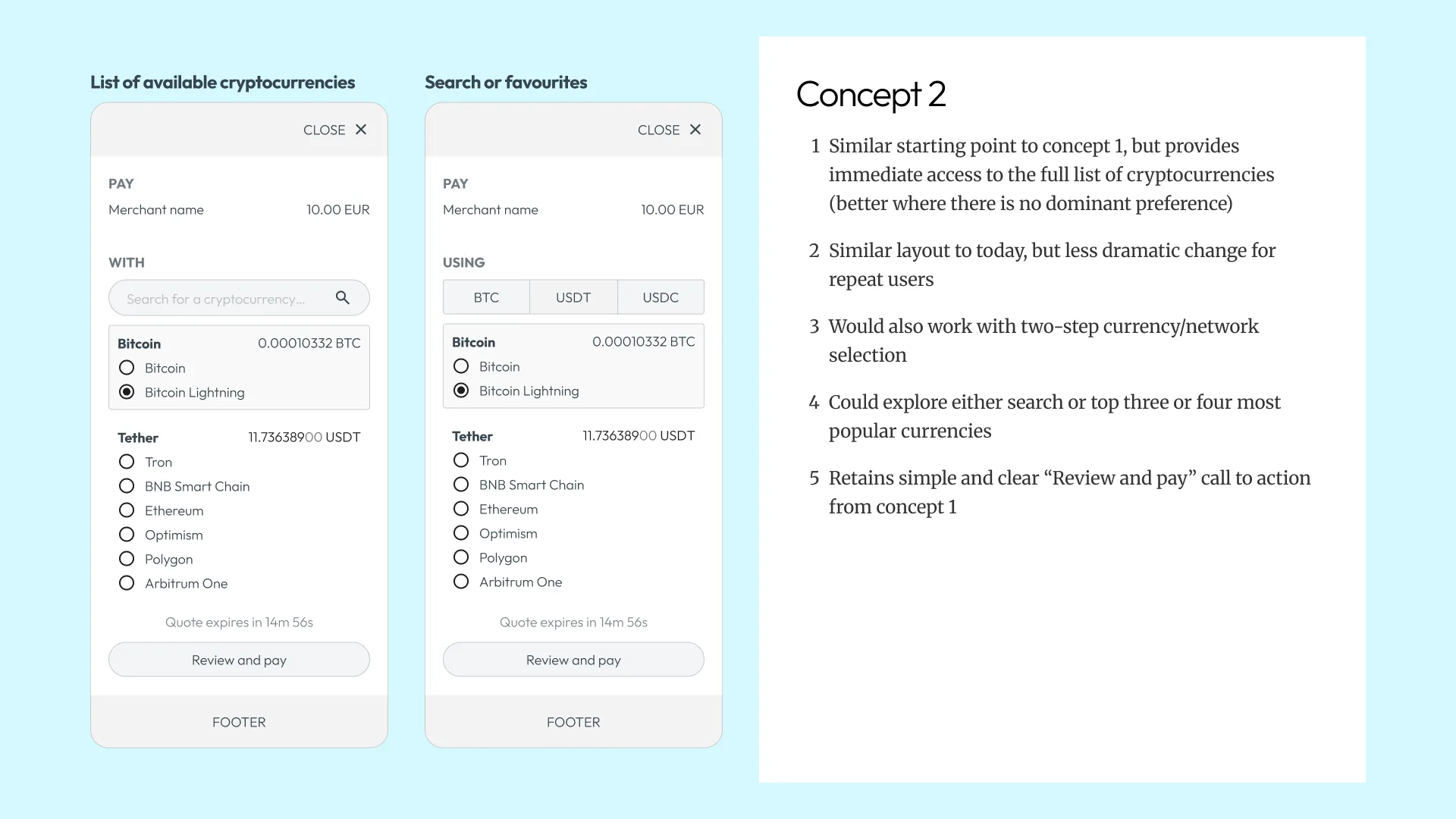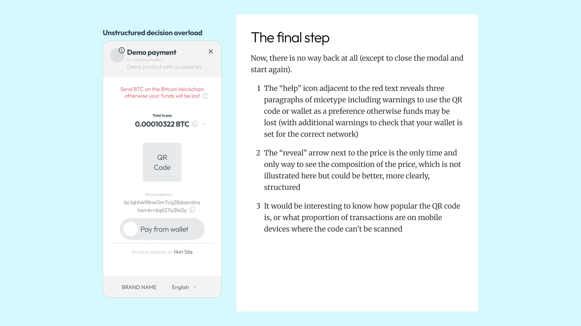 Before sketching anything, I needed to understand what “good” looks like in this space. Crypto checkouts sit in an odd position – they need the trust cues of traditional payment flows but handle unfamiliar concepts like wallet selection and network fees. I spent roughly half my time on research: benchmarking industry patterns, reviewing Baymard’s checkout guidelines, and documenting the existing experience.