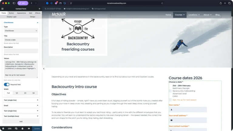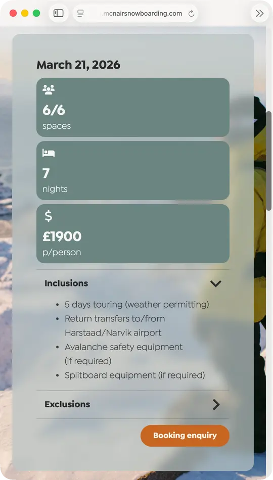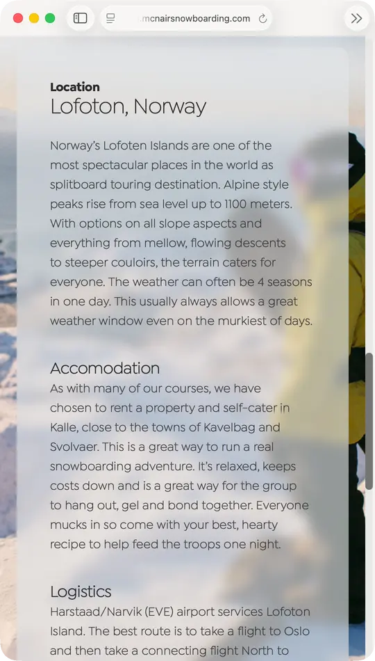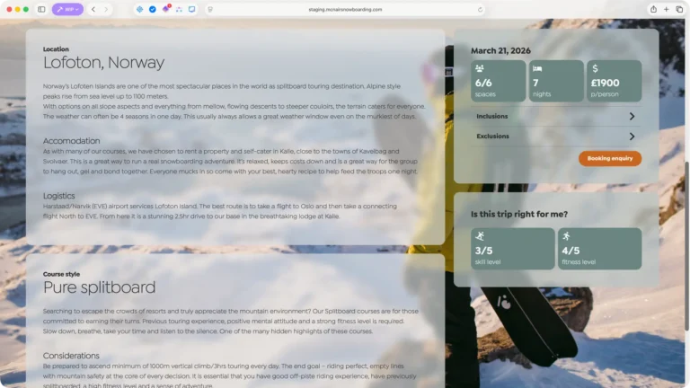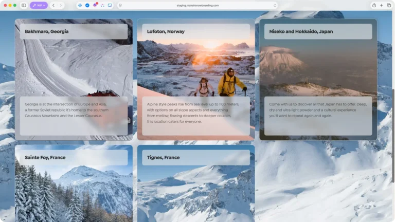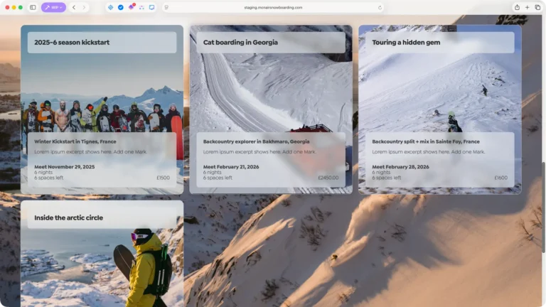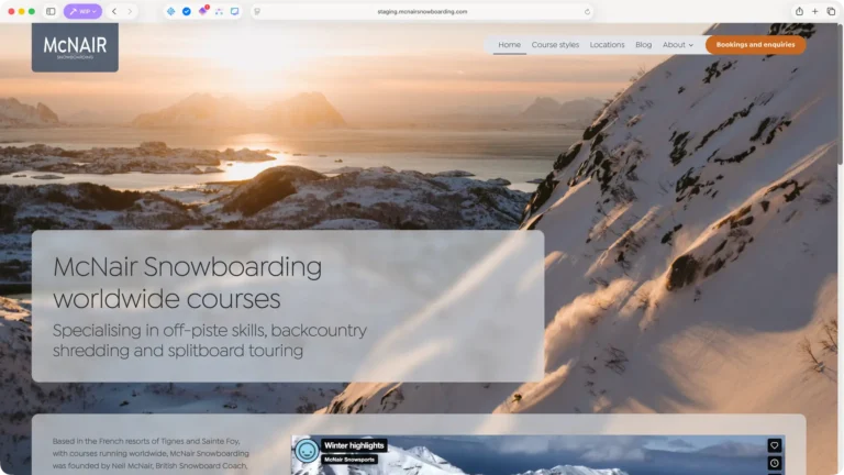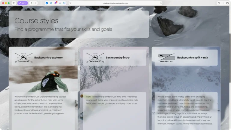 Neil McNair has spent 25 years running snowboarding courses in some of the world’s most spectacular locations. The previous website had access to this incredible photography but buried it behind boxed layouts and dense text blocks. The redesign strips everything back, using translucent frosted panels that float over full-bleed imagery – letting the mountains, the snow and the adventure sell the experience.