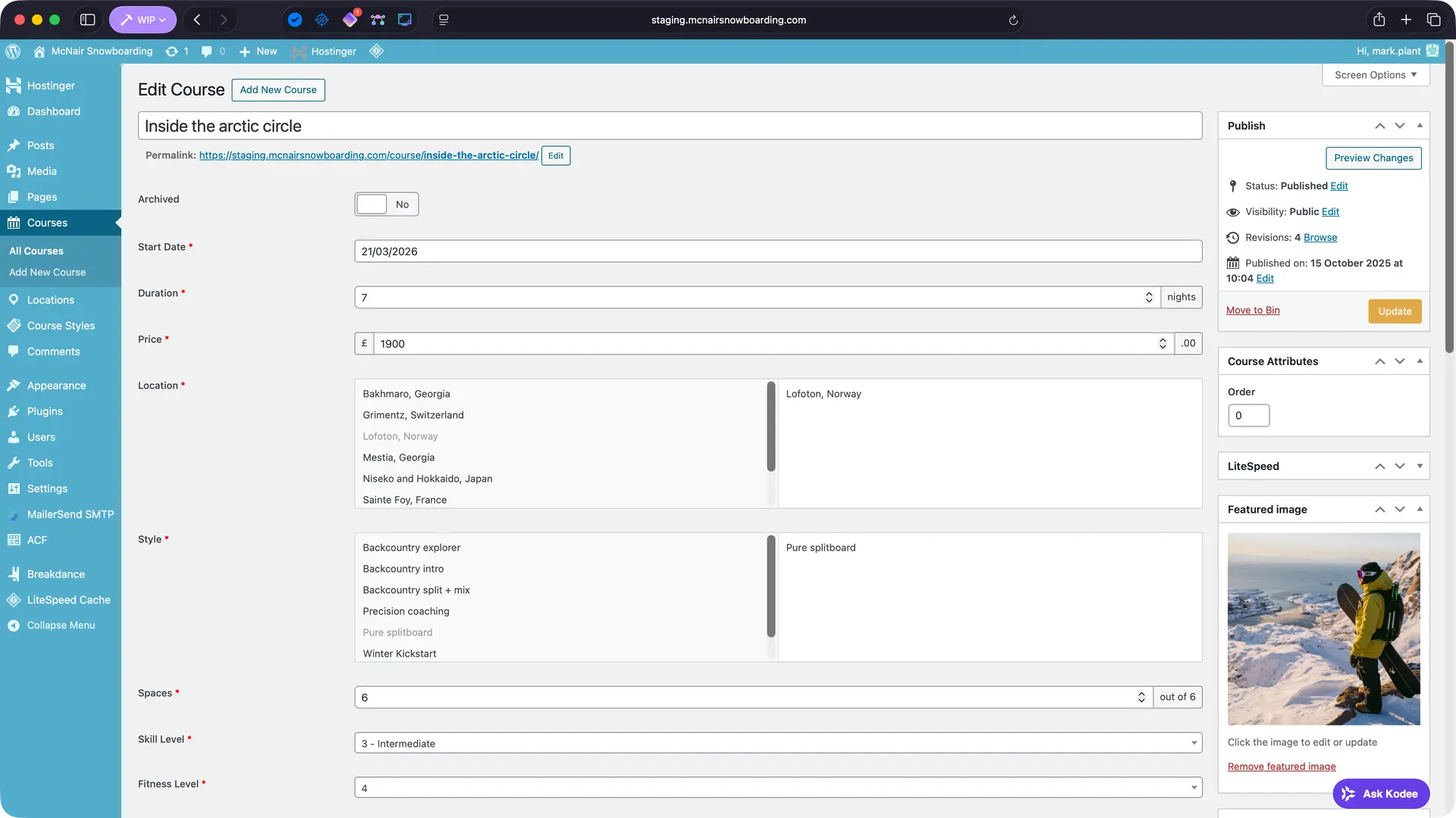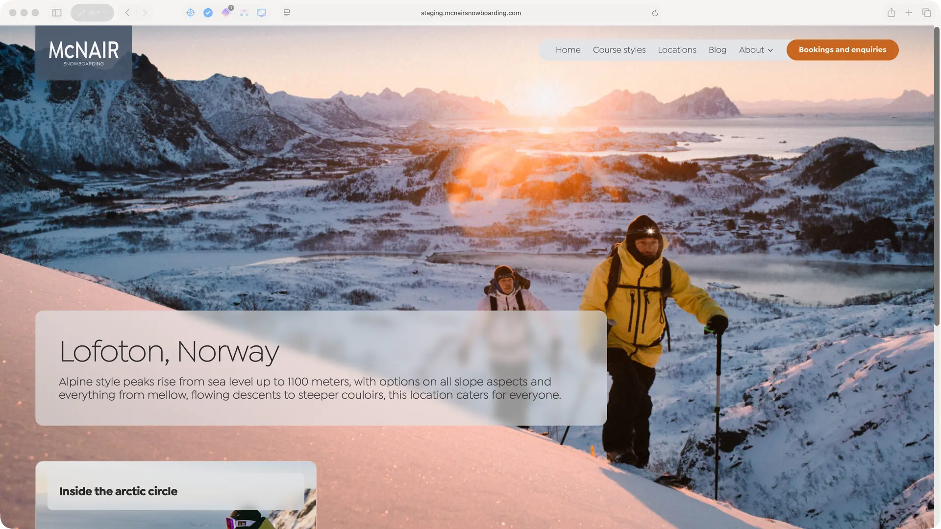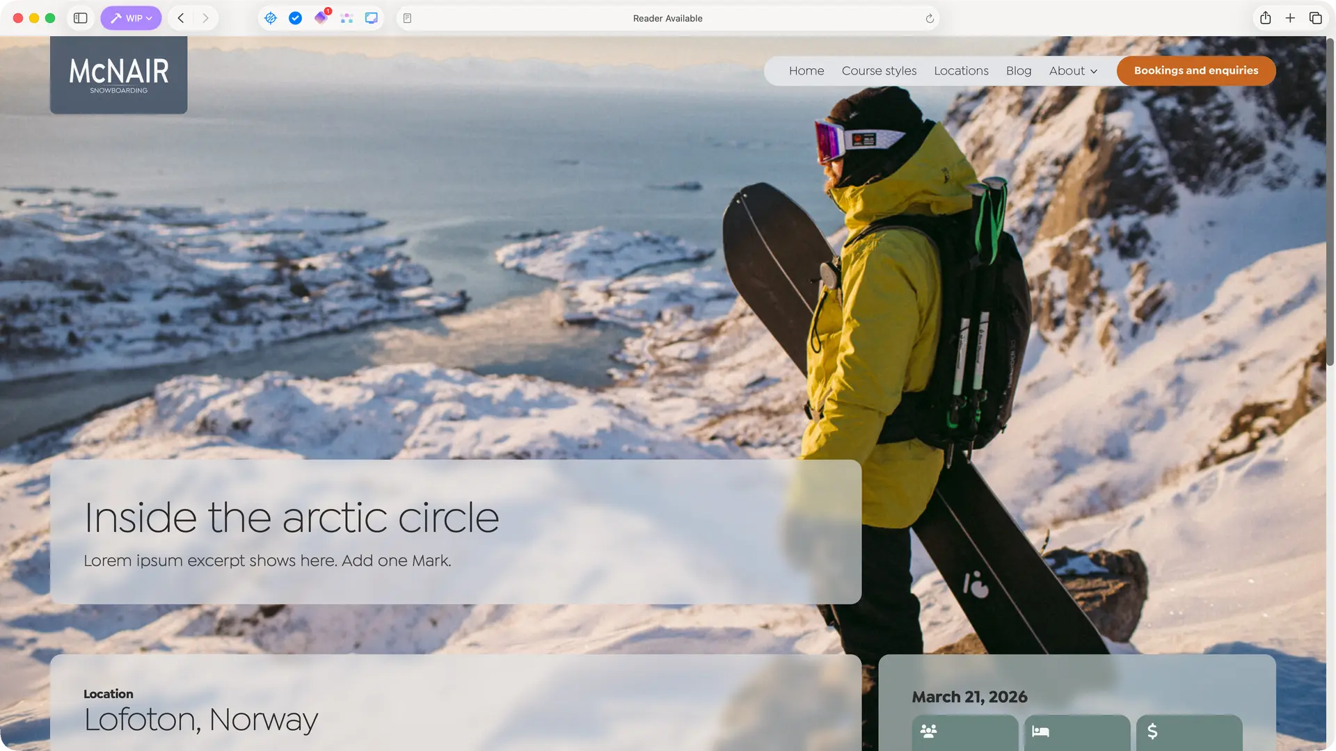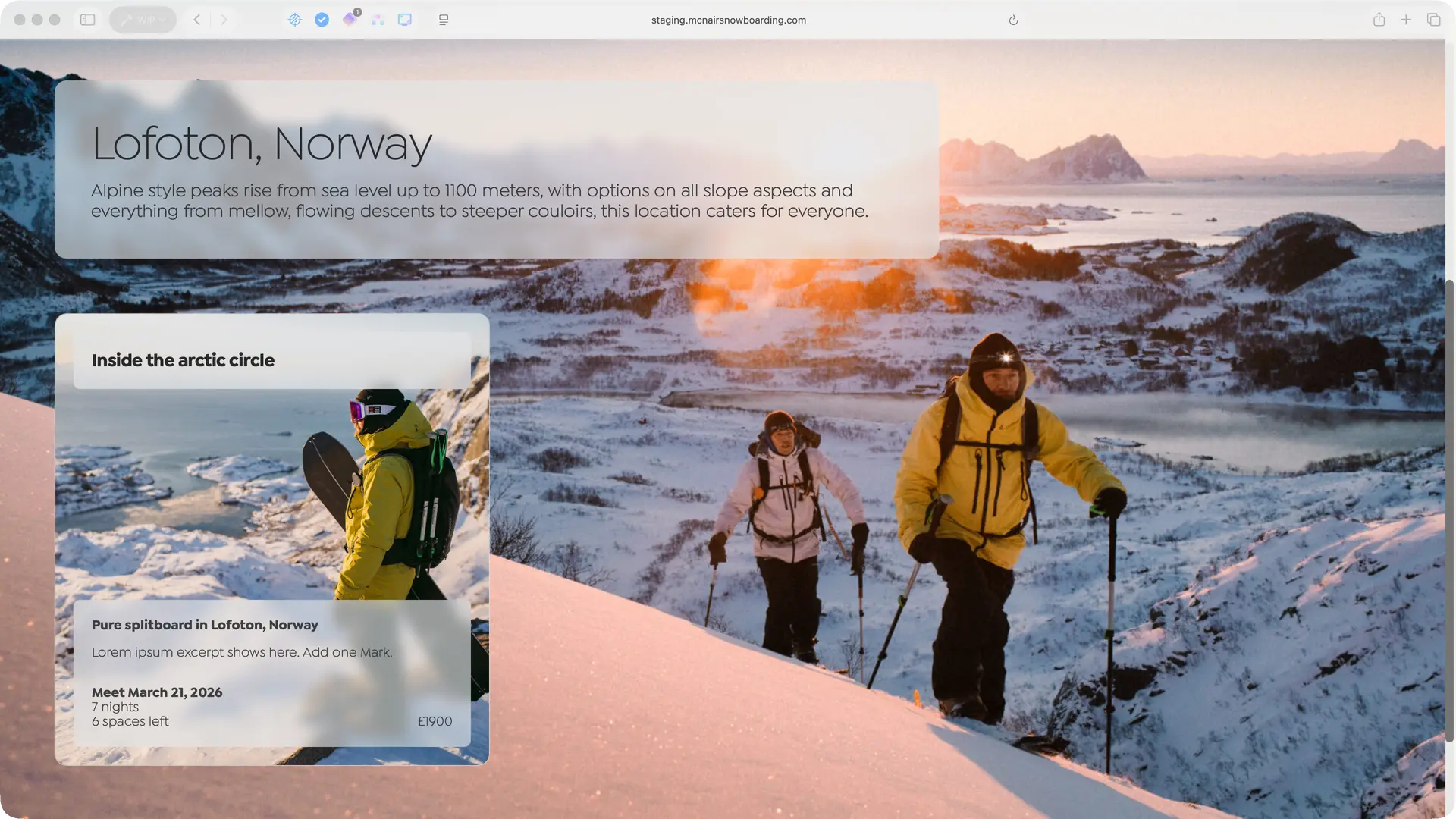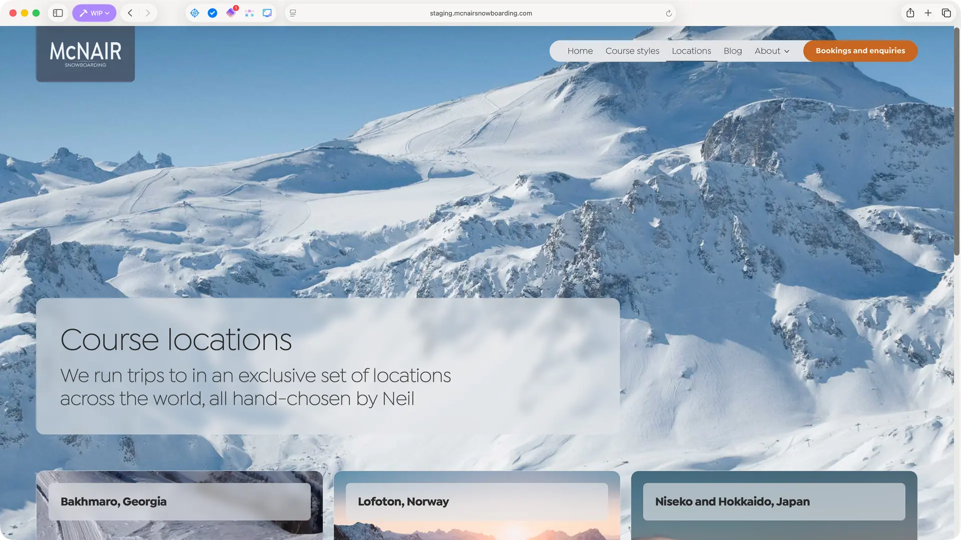 Neil McNair has spent 25 years running snowboarding courses in some of the world’s most spectacular locations. The previous website had access to this incredible photography but buried it behind boxed layouts and dense text blocks. The redesign strips everything back, using translucent frosted panels that float over full-bleed imagery – letting the mountains, the snow and the adventure sell the experience.