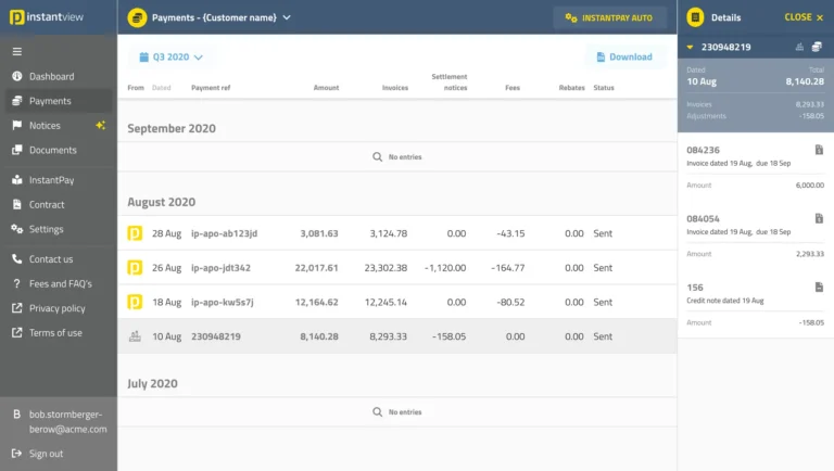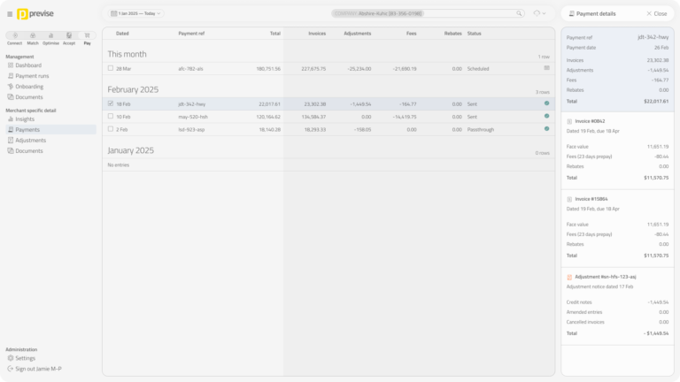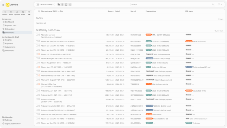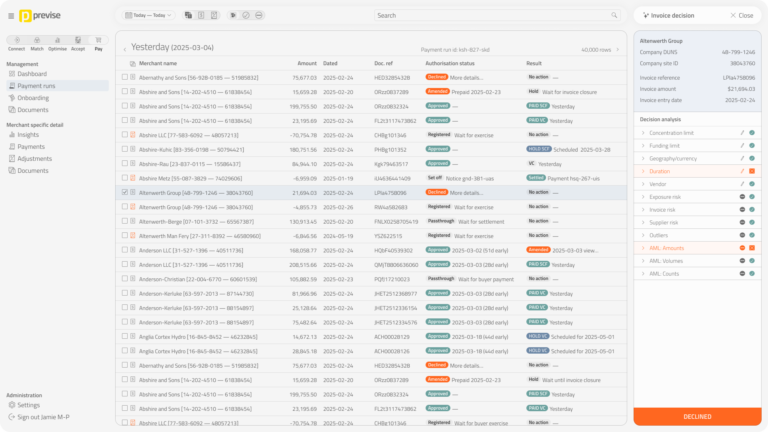 SmartPay was Previse’s virtual card payment product. I designed a portal concept for sales discussions and the website — combining operations management views (document queues, payment runs) with supplier self-service screens. Bundling both perspectives into one UI made production faster and reflected how ops staff would actually investigate issues: by seeing what suppliers see. Never built, but useful for moving conversations forward.